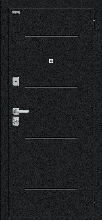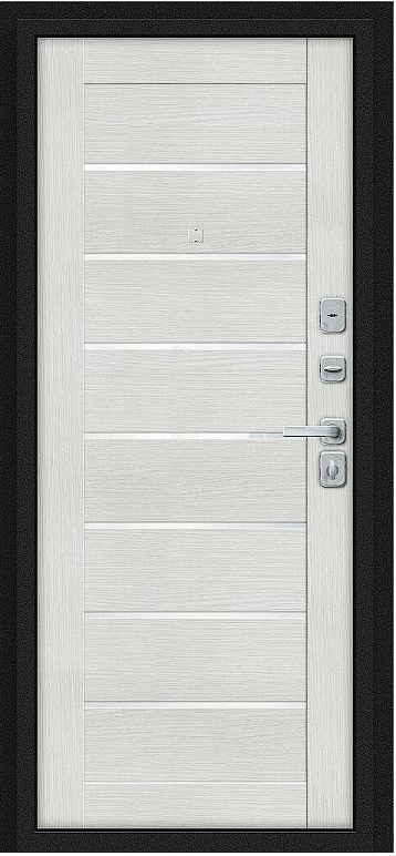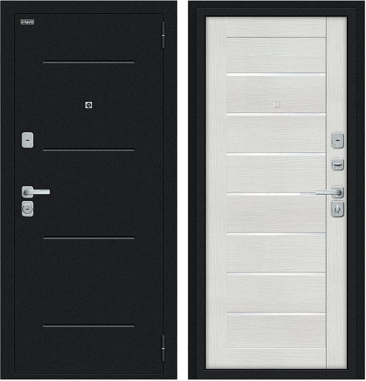 Надежная входная Дверь Браво Техно/BChrome Букле черное/Bianco Melinga премиум класса по цене 33 663 руб. Большая толщина стали защитит от проникновения в ваш дом, квартиру или коттедж. Используется очень качественная фурнитура: замки, цилиндры, ручки, защелки. Покрытие и отделка двери изготовлено под внимательным контролем производителя. Дверь имеет долгий срок службы и гарантию.